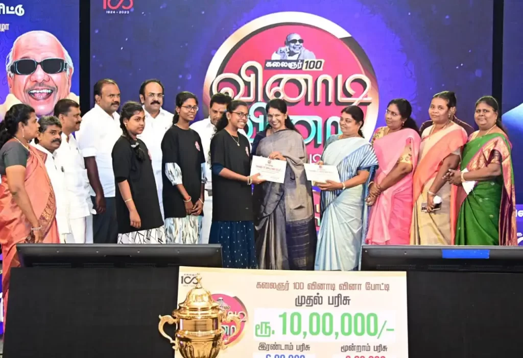 வினாடி வினா போட்டியாளர்களுக்கு கனிமொழி எம்.பி. ஆறுதல் பரிசுகளை வழங்கினார். இந்நிகழ்ச்சியில் அமைச்சர்கள் தங்கம் தென்னரசு, கீதா ஜீவன், அனிதா ராதாகிருஷ்ணன் ஆகியோர் கலந்து கொண்டு உரையாற்றினார்கள்.