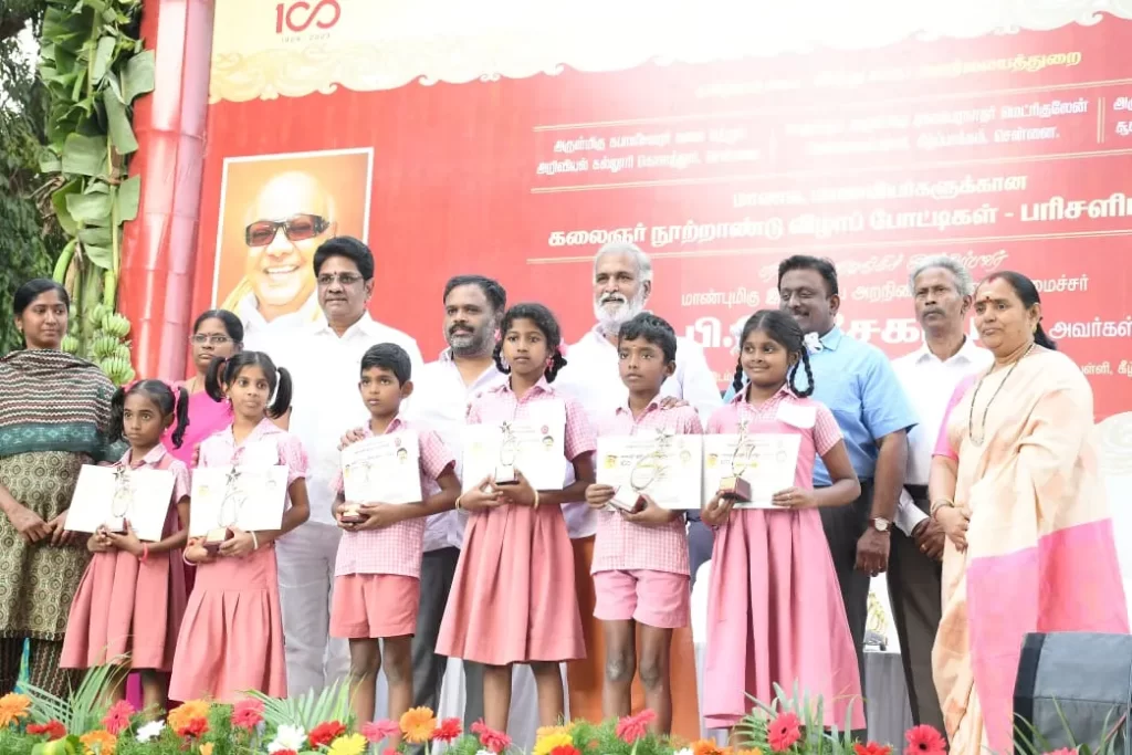 மறைந்த முன்னாள் முதலமைச்சர் கருணாநிதியின் நூற்றாண்டு கலைஞர் நூற்றாண்டு விழாவை முன்னிட்டு திருக்கோயில்கள் சார்பில் பள்ளி மற்றும் கல்லூரிகளில் இலக்கியம் மற்றும் விளையாட்டுப் போட்டிகள் நடைபெற்றது. இதில் சிறப்பாக தங்களது திறமைகளை வெளிப்படுத்தி வெற்றி பெற்ற மாணவ, மாணவிகளுக்கு அமைச்சர் பி.கே.சேகர்பாபு பரிசுகள் மற்றும் சான்றிதழ்களை வழங்கி கவுரவித்தார்.