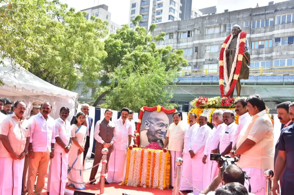காந்தி ஜெயந்தியை முன்னிட்டு மகாத்மா காந்தியின் உருவப் படத்திற்கு முதலமைச்சர் மு.க.ஸ்டாலின் மற்றும் தமிழக ஆளுநர் ஆர்.என்.ரவி மலர் தூவி மரியாதை செலுத்தினர்.