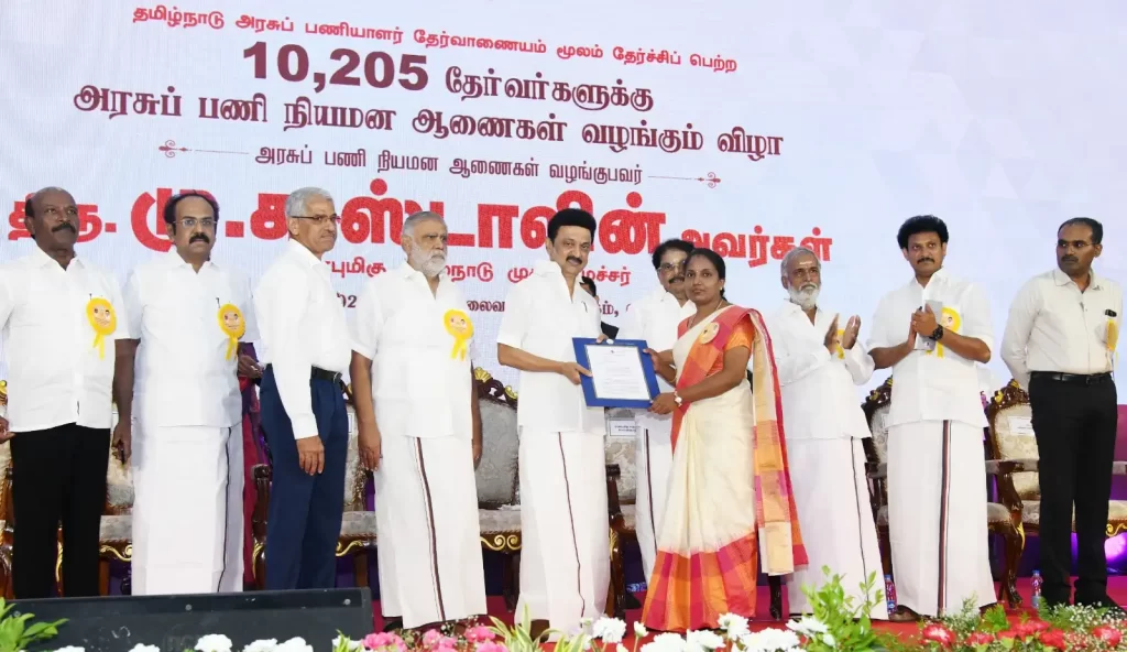 சென்னை கலைவாணர் அரங்கத்தில் டி.என்.பி.எஸ்.சி. மூலம் அரசு பணிக்கு தேர்வு செய்யப்பட்ட 10,205 பேருக்கான பணி நியமன ஆணை வழங்கும் விழா நடைபெற்றது. அதன்படி இளநிலை உதவியாளர்கள், தட்டச்சர்கள், சுருக்கெழுத்தர்கள் உள்ளிட்டோருக்கான பணிநியமன ஆணைகள் வழங்கும் விழாவில் முதலமைச்சர் மு.க.ஸ்டாலின் தலைமையேற்று பணி ஆணைகளை வழங்கினார்.