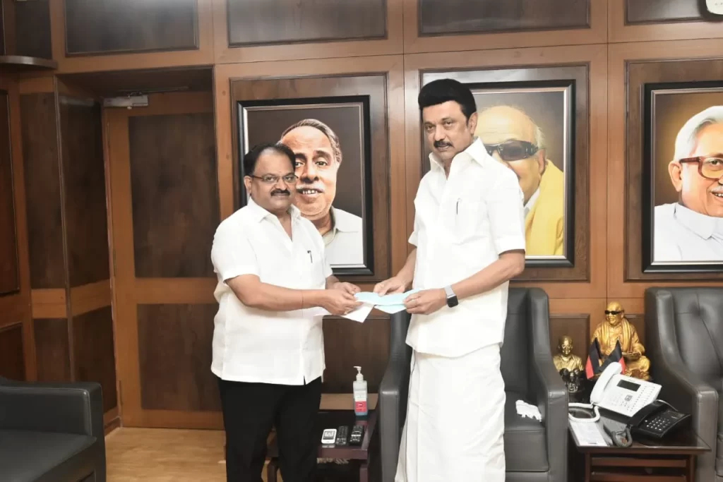 அந்த வகையில் இன்று (டிச. 16) முதலமைச்சர் மு.க.ஸ்டாலினை தமிழ்நாடு வீட்டு வசதி வாரிய தலைவர் பூச்சி எஸ்.முருகன்  சந்தித்து, மிக்ஜாம் புயல் பேரிடர் நிவாரணப் பணிகளுக்காக முதலமைச்சர் பொது நிவாரண நிதிக்கு தனது ஒரு மாத முழு சம்பளத்தை காசோலையாக வழங்கினார்.