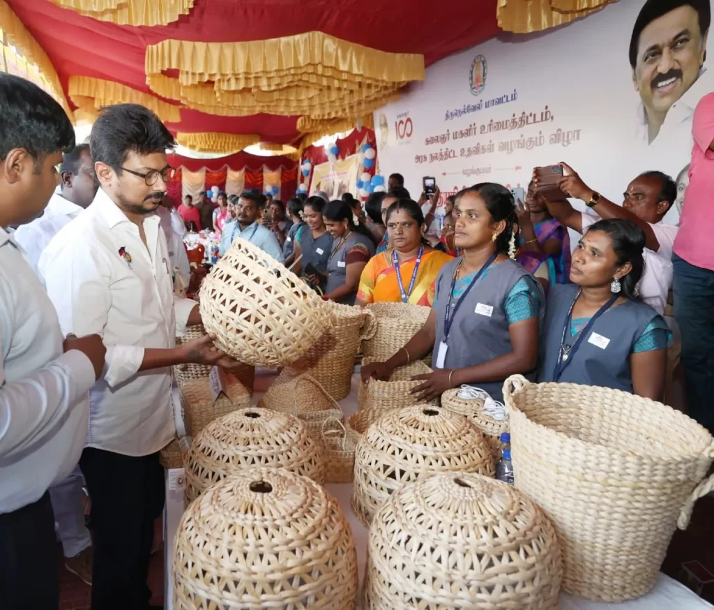 திருநெல்வேலி மாவட்டத்தில் நடைபெற்ற நலத்திட்ட உதவிகள் வழங்கும் விழாவில் அமைச்சர் உதயநிதி ஸ்டாலின் கலந்து கொண்டார். மேலும் மகளிர் சுய உதவிக்குழுவினரால் தயாரிக்கப்பட்ட கைவினைப் பொருட்களையும் அமைச்சர் உதயநிதி பார்வையிட்டு அவர்களை ஊக்கப்படுத்தினார்.