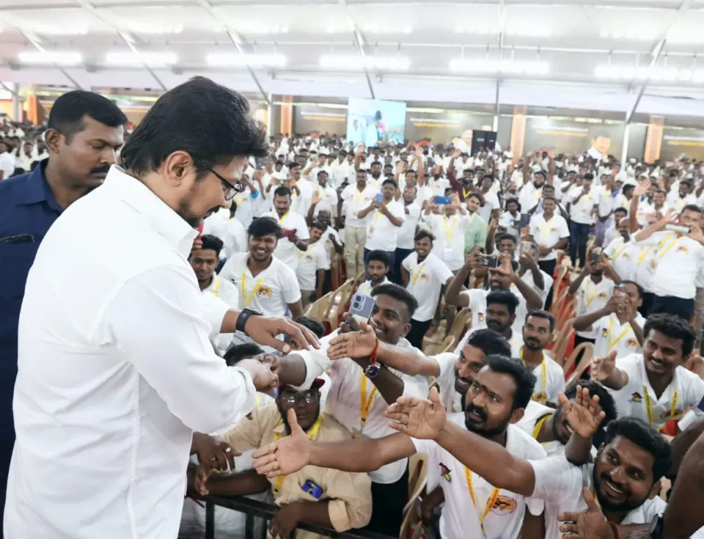 அமைச்சர் உதயநிதி ஸ்டாலின் உரையை கேட்டுக் கொண்டிருந்த இளைஞர்கள் அணியினர் உற்சாகமாக கைத்தட்டி தங்கள் ஆதரவை தெரிவித்தனர்.