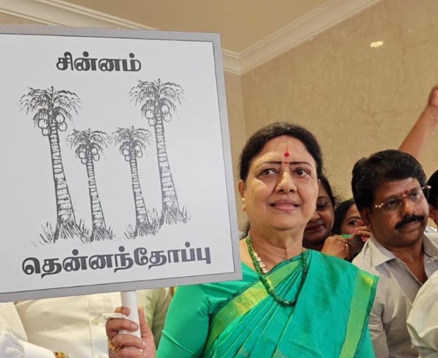 கட்சியில், இன்று இணைந்துள்ள சசிகலா தென்னந்தோப்பு சின்னத்தில் தேர்தலை சந்திக்கப்