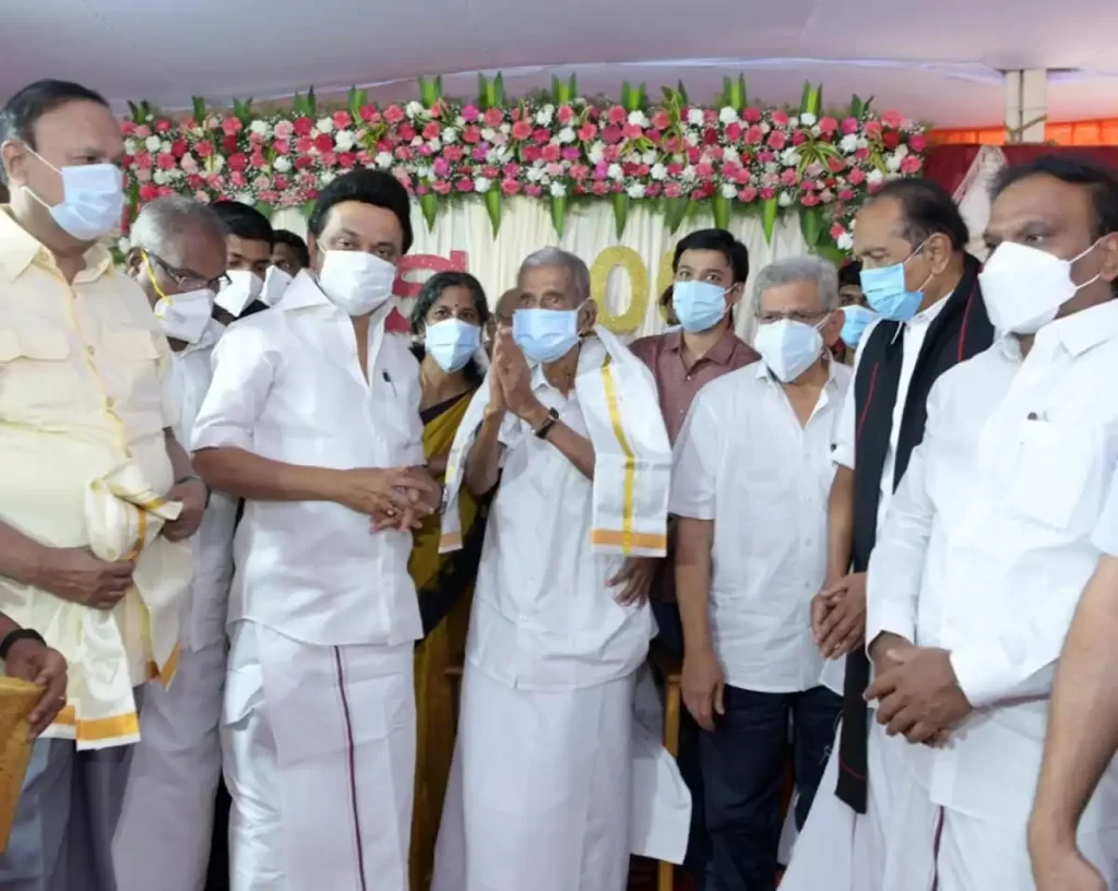 கம்யூனிஸ்ட்சி கட்சியின் மூத்த தலைவரும், சுதந்திர போராட்ட வீரருமான தகைசால் தமிழரான சங்கரய்யாவுக்கு வயது 102. நூற்றாண்டை கடந்த சங்கரய்யாவின் 102வது பிறந்தநாளை முன்னிட்டு கடந்த ஜூலை 15ம் தேதி முதலமைச்சர் மு.க.ஸ்டாலின், வைகோ உள்ளிட்ட தலைவர்கள் பிறந்தநாள் வாழ்த்துக்களை தெரிவித்தனர்.