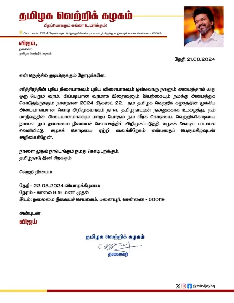 தமிழக வெற்றிக்கழகத் தலைவர் விஜய், கட்சிக் கொடி அறிவிப்பு குறித்து அறிக்கை ஒன்றை வெளியிட்டுள்ளார். அந்த அறிக்கையில், என் நெஞ்சில் குடியிருக்கும் தோழர்களே. சரித்திரதின புதிய திசையாகவும், புதிய விசையாகவும் ஒவ்வொரு நாளும் அமைந்தால் அது ஒரு பெரும் வரம். அப்படிப்பட்ட வரமாக இறைவனும் இயற்கையும் நமக்கு அமைத்துக் கொடுத்திருக்கும் நாள்தான் 2024ஆகஸ்டு 22. தமிழக வெற்றிக்கழகத்தின் முக்கிய அடையாளமான கொடி அறிமுகமாகும் நாள். தமிழ்நாட்டின் நலனுக்காக உழைத்து, நம் மாநிலத்தின் அடையாளமாகவும், மாறப்போகும் […]