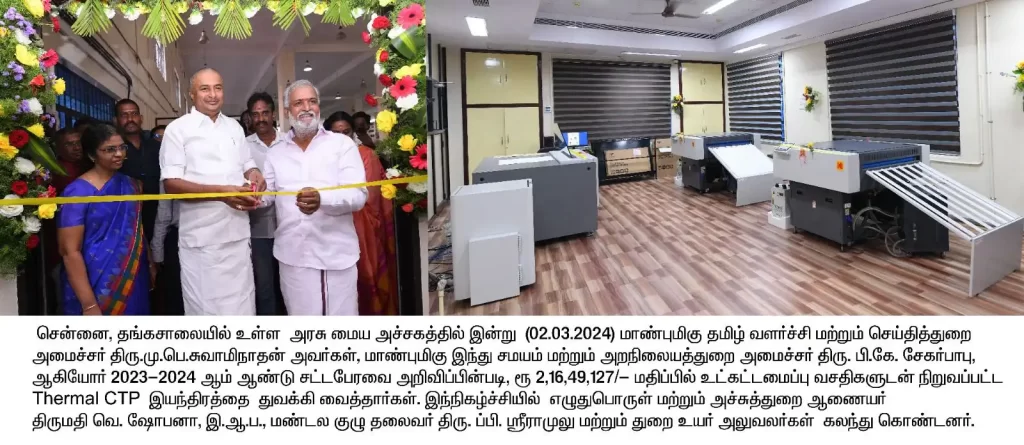 சென்னை, தங்கசாலையில் உள்ள அரசு மைய அச்சகத்தில் இன்று (02.03.2024) மாண்புமிகு தமிழ் வளர்ச்சி மற்றும் செய்தித்துறை அமைச்சர் திரு.மு.பெ.சுவாமிநாதன் அவர்கள், மாண்புமிகு இந்து சமயம் மற்றும் அறநிலையத்துறை அமைச்சர் திரு. பி.கே. சேகர்பாபு, ஆகியோர் 2023-2024 ஆம் ஆண்டு சட்டபேரவை அறிவிப்பின்படி, ரூ 2,16,49,127/- மதிப்பில் உட்கட்டமைப்பு வசதிகளுடன் நிறுவப்பட்ட Thermal CTP இயந்திரத்தை துவக்கி வைத்தார்கள். இந்நிகழ்ச்சியில் எழுதுபொருள் மற்றும் அச்சுத்துறை ஆணையர் திருமதி வெ. ஷோபனா, இ.ஆ.ப., மண்டல குழு தலைவர் திரு. […]
