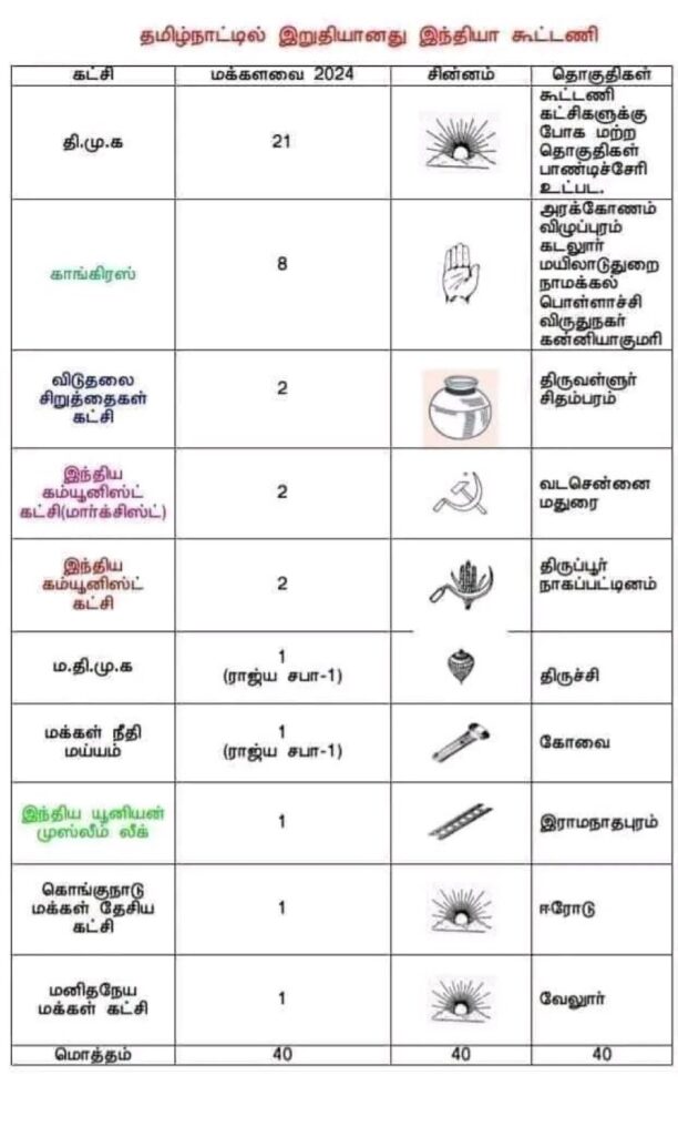 தி.மு.க.வுடன் காங்கிரஸ் மற்றும் கம்யூனிஸ்ட் கட்சிகள் தேர்தல் உடன்பாடு இறுதிக்கட்ட பேச்சுவார்த்தை நடத்திவருகின்றன. இந்த நிலையில் தி.மு.க.வின் உத்தேசப் பட்டியல் ஒன்று வெளியிடப்பட்டிருக்கிறது. இதையொட்டி தி.மு.க. கூட்டணியில் கடும் புகைச்சல் எழுந்துள்ளது. கடந்த முறை காங்கிரஸ் கட்சிக்கு 10 தொகுதிகள் ஒதுக்கப்பட்டு அதில் 9 தொகுதிகளில் வெற்றி பெற்றது. இந்த நிலையில் 2024 தேர்தலில் காங்கிரஸ் கட்சிக்கு 8 தொகுதிகள் மட்டுமே ஒதுக்கப்பட்டுள்ளன. அரக்கோணம், விழுப்புரம், கடலூர், மயிலாடுதுறை, நாமக்கல், பொள்ளாச்சி, விருதுநகர், கன்னியாகுமரி ஆகிய தொகுதிகள் […]