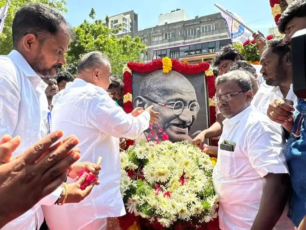 காந்தி ஜெயந்தி! திருவுருவப் படத்திற்கு புஸ்ஸி ஆனந்த் மலர் தூவி மரியாதை!