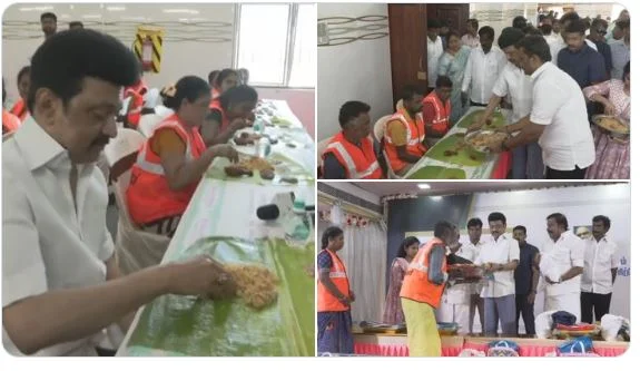 தூய்மை பணியாளர்களுடன் அமர்ந்து பிரியாணி சாப்பிட்ட முதல்வர்!