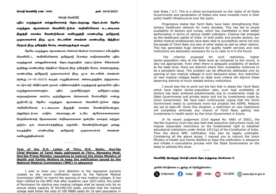 புதிய மருத்துவக் கல்லூரி தொடர்பான தேசிய மருத்துவ ஆணையை நிறுத்தி வைக்க வேண்டும் என்று பிரதமர் நரேந்திரமோடிக்கு தமிழக முதலமைச்சர் மு.க.ஸ்டாலின் கடிதம் வாயிலாக கேட்டுக் கொண்டுள்ளார்.