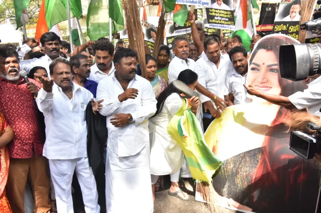 இந்நிலையில் இன்று காலை நடிகை குஷ்புவின் வீட்டை எஸ்.சி.துறை மாநில தலைவர் ரஞ்சன்குமார், பட்டியலினப் பெண்களுடன் சேர்ந்து முற்றுகையிட்டார். பின்னர் குஷ்புவின் புகைப்படத்தை செருப்பு, துடைப்பம் மற்றும் சாணியால் அடித்து ஆர்ப்பாட்டத்தில் ஈடுபட்டனர். குஷ்புவுக்கு எதிரான கோஷங்கள் எழுப்பிய நிலையில், அங்கு பாதுகாப்பில் ஈடுபட்டிருந்த போலீசார் அவர்களை தடுத்து நிறுத்தி கைது செய்தனர்.