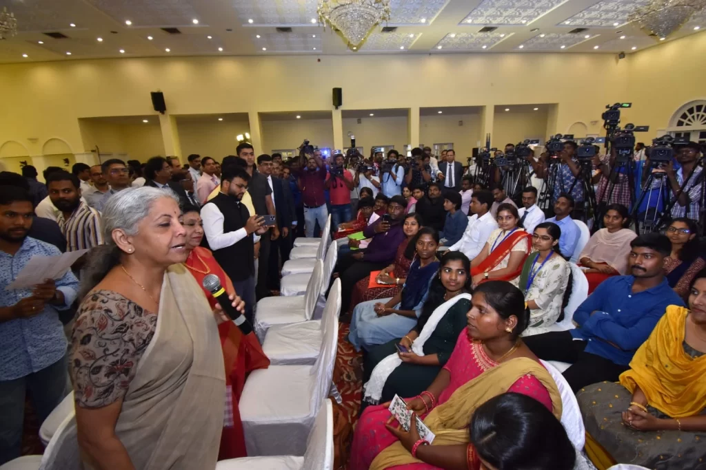 அதன் ஒரு பகுதியாக மத்திய நிதி அமைச்சர் நிர்மலா சீதாராமன் சென்னை எழும்பூரில் அமைந்துள்ள தனியார் ஓட்டலில் நடைபெறும் வேலை வாய்ப்பு விழா நிகழ்ச்சியில் கலந்து கொண்டார். அப்போது மத்திய அரசு பணிகளில் தேர்வு செய்யப்பட்டவர்களிடம் நிர்மலா சீதாராமன் கலந்துரையாடினார்.