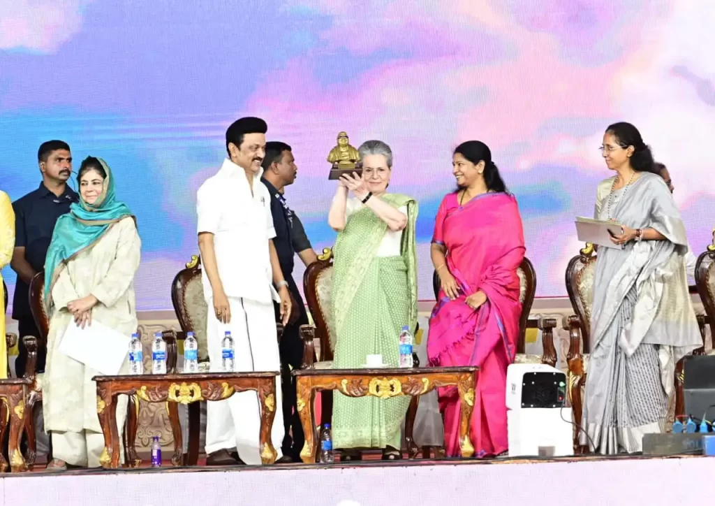 மாண்புமிகு தமிழ்நாடு முதலமைச்சர் திரு மு.க. ஸ்டாலின் அவர்கள் தலைமையில் 14.12.2023 அன்று நந்தனம் ஒய்எம்.சி.ஏ. திடலில் முத்தமிழ் அறிஞர் கலைஞர் அவர்களின் நூற்றாண்டை முன்னிட்டு கழக மகளிர் அணி ஒருங்கிணைப்பில் நடைபெற்ற மகளிர் உரிமை மாநாட்டில் இந்திய காங்கிரஸ் கட்சியின் நாடாளுமன்ற குழுத் தலைவர் திருமதி சோனியா காந்தி அவர்களுக்கு முத்தமிழ் அறிஞர் அவர்களின் சிலையினை நியூ பரிசாக வழங்கினார்.